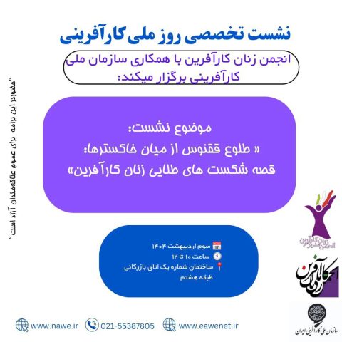 نشست تخصصی روز ملی کارآفرینی با موضوع زنان کارآفرین با همراهی انجمن زنان کارآفرین و سازمان ملی کارآفرینی ایران برگزار می گردد. تاریخ: چهارشنبه، ۳ اردیبهشت ماه زمان: ساعت ۱۰