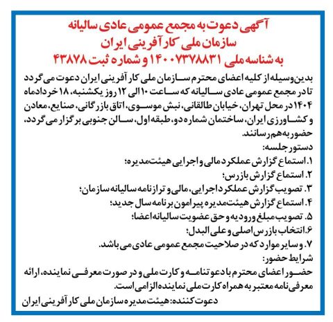 احتراما بدینوسیله از کلیه اعضای محترم سازمان ملی کارآفرینی ایران به شناسه ملی ۱۴۰۰۷۳۷۸۸۳۱ و شماره ثبت ۴۳۸۷۸ دعوت میگردد تا در مجمع عمومی عادی سالیانه که ساعت ۱۰ الی